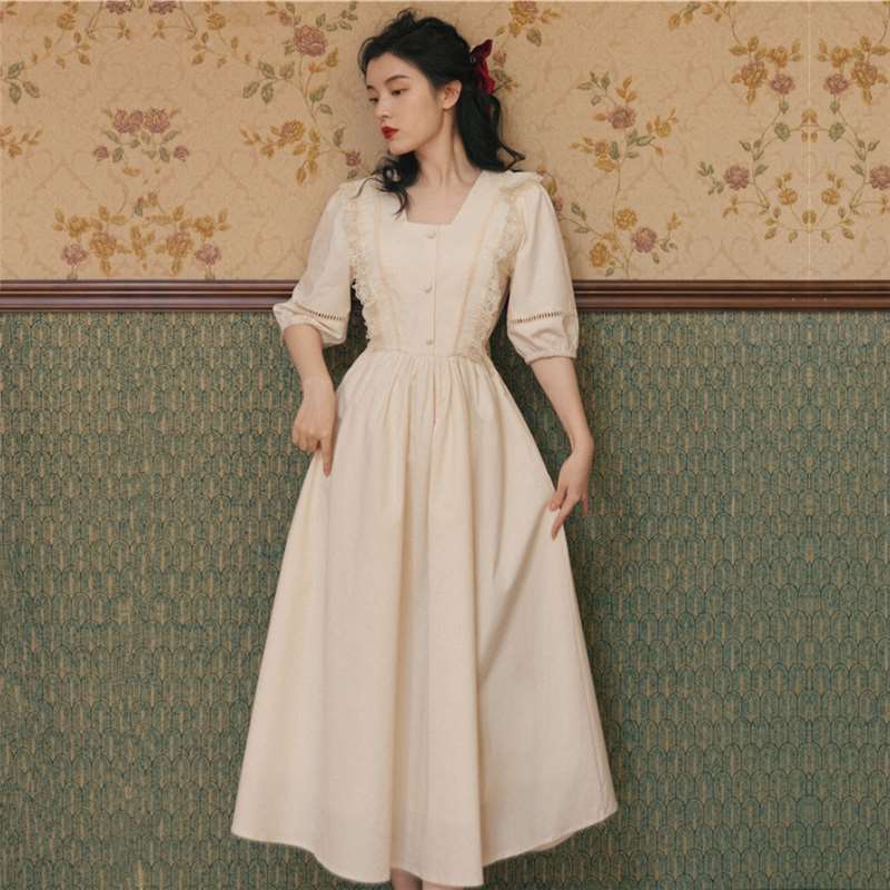 法式复古收腰显瘦初恋甜美长裙子温柔风别致设计感方领连衣裙女夏热门设计联盟服务商